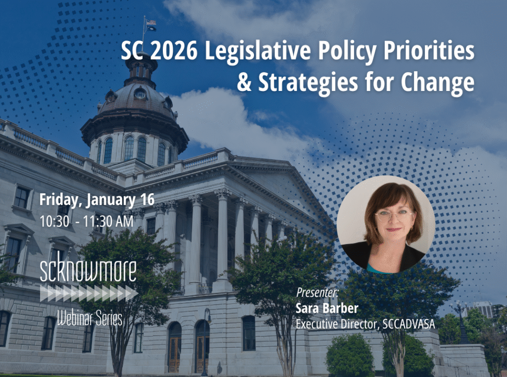 Join the SCCADVASA Webinar Series (SCKnowMore) featuring Sara Barber, Executive Director of SCCADVASA. Learn how public policy can create lasting change and how you can be part of the movement toward a safer, more equitable South Carolina.